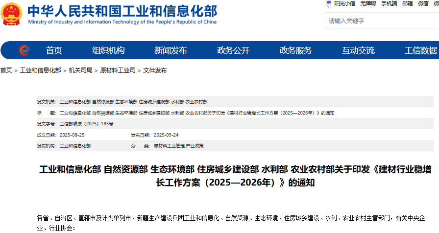 【环球网财经综合报道】9月24日,工业和信息化部等六部门联合印发《建材行业稳增长工作方案(2025—2026年)》,为正处于转型关键期的建材行业描绘了清晰的未来发展蓝图。方案以“严禁新增水泥、玻璃产能”为强硬底线,同时设定“2026年绿色建材营收超3000亿元”的明确目标,标志着我国建材行业政策正从单一产能调控,转向构建以新质生产力为核心的现代产业体系。