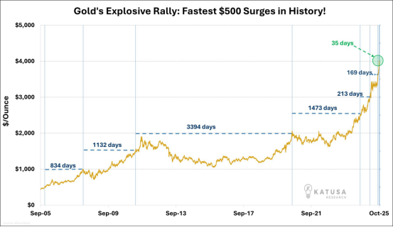 此次金价上涨堪称"史上最快价值增长"。历史数据显示,国际现货黄金从每盎司1500美元攀升至2000美元耗时3394天,突破3000美元用了213天,而从3500美元到4000美元仅用35天,今年以来累计涨幅已达53%。这一涨势背后,是黄金市场定价逻辑的根本性转变——其核心价值已从普通商品升级为"货币体系稳定器"与"跨周期风险对冲工具",主权储备配置、去美元化需求、资产组合分散化等制度性因素成为定价关键。