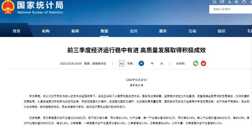 尽管三季度GDP增速较二季度回落0.4个百分点,但国家统计局新闻发言人强调,中国经济“稳”的格局、“进”的势头、“韧”的特性没有改变。三季度4.8%的增速仍明显高于多数主要经济体,经济总量达35.5万亿元,超过全球第三大经济体2024年全年总量。