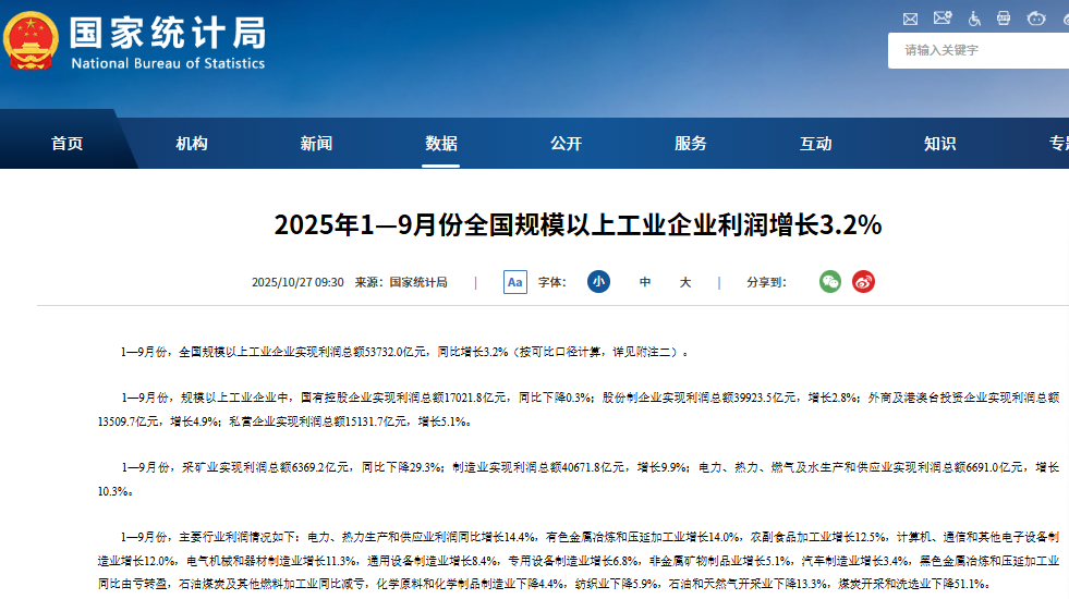 【环球网财经综合报道】国家统计局10月27日发布的数据显示,2025年1—9月份,中国规模以上工业企业利润呈现加快恢复态势,利润增速继续回升,新质生产力发展动能强劲。