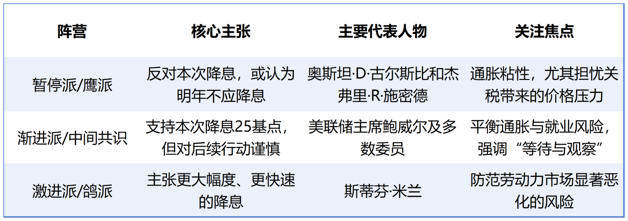 首先,政策声明的微妙变化抬高了未来行动的门槛。声明中新增了将考虑进一步调整政策的“幅度和时机”的表述。这一措辞的回归被广泛解读为暗示下一次会议(2026年1月)很可能“暂停”降息,为观察经济数据留出窗口期。同时,声明删除了此前对失业率“保持低位”的判断,仅称其“截至9月略微攀升”,显示美联储对劳动力市场的评估转向谨慎。