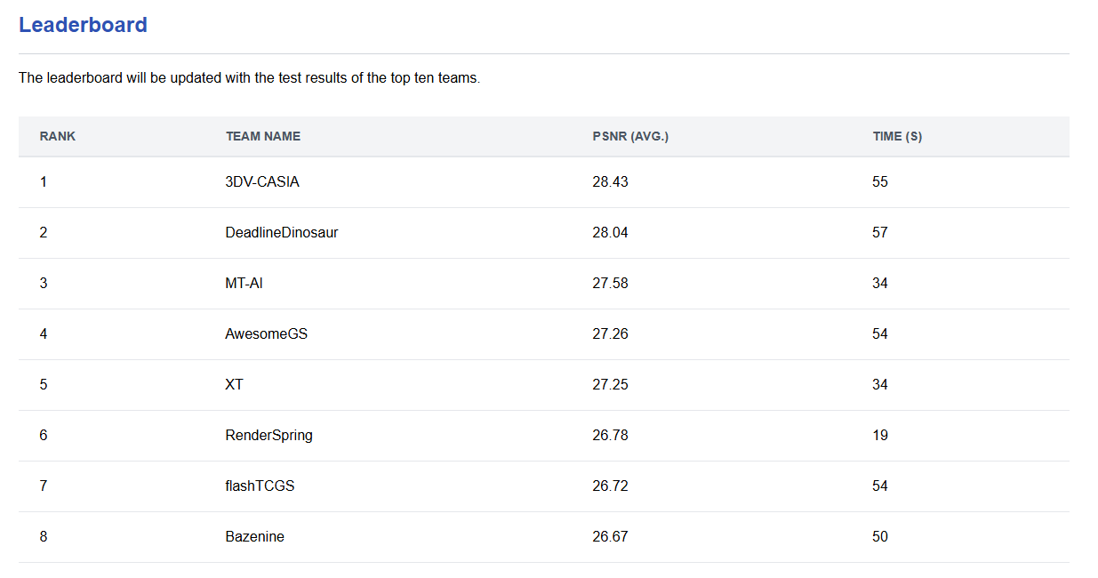 目前3D Gaussian Splatting Reconstruction Challenge(3DGS 重建挑战赛)的结果及数据集已向全球公开,相关资料可在 SIGGRAPH Asia 官方网站获取(https://gaplab.cuhk.edu.cn/projects/gsRaceSIGA2025/)。