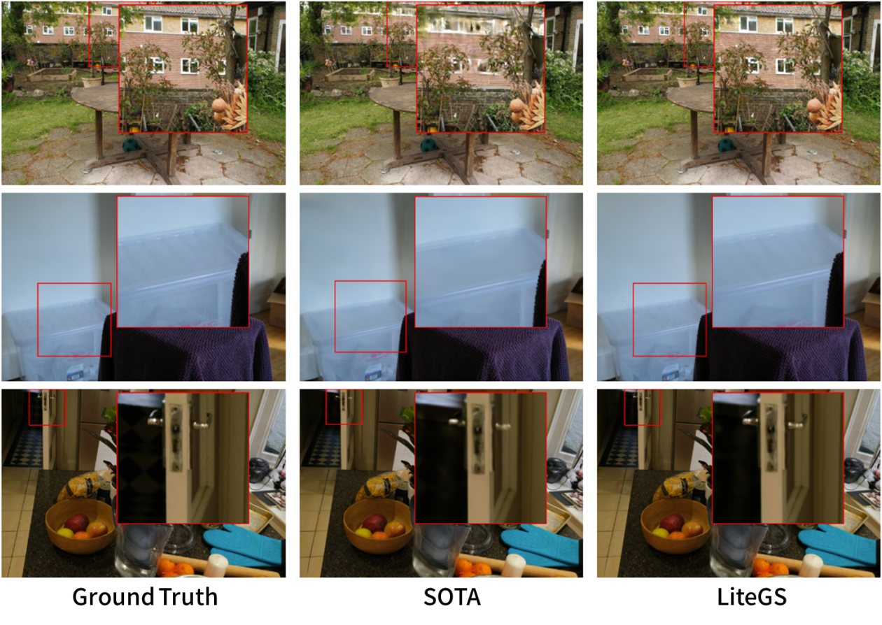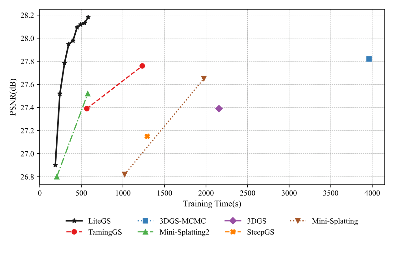 通过系统与算法的协同优化,LiteGS在训练效率与重建质量上均实现显著领先,树立了该领域新的性能标杆。在达到与当前质量最优方案同等水平时,LiteGS可获得高达10.8倍的训练加速,且参数量减少一半以上;在相同参数量下,LiteGS在PSNR指标上超出主流方案0.2–0.4 dB,训练时间缩短3.8至7倍。针对轻量化模型,LiteGS仅需原版3DGS约10%的训练时间与20%的参数量,即可实现同等质量,展现出卓越的工程实用性与技术前瞻性。