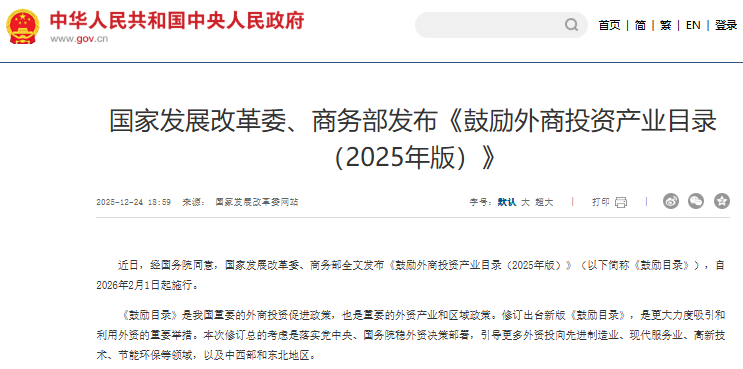 【环球网财经综合报道】12月24日,国家发展改革委、商务部联合发布《鼓励外商投资产业目录(2025年版)》(以下简称《鼓励目录》),标志着我国外资鼓励政策迎来新一轮优化升级。该目录将于2026年2月1日起正式施行,同时废止2022年版鼓励目录。新版《鼓励目录》通过优化外资投向和完善区域布局,释放出我国扩大高水平对外开放的坚定信号,旨在以自身发展的确定性应对外部环境的不确定性,为全球投资者提供清晰、稳定、透明的投资预期。