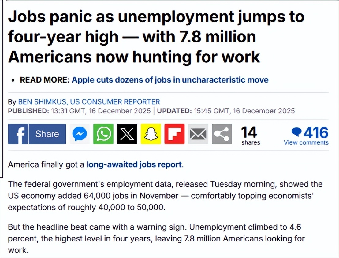 【环球网财经综合报道】近期,美国劳工部合并发布的10-11月非农数据显示,11月失业率升至4.6%,创2021年10月以来四年新高。就业市场整体走弱的同时,AI驱动的结构性裁员潮席卷多行业,标志着劳动力市场正经历深刻转变。