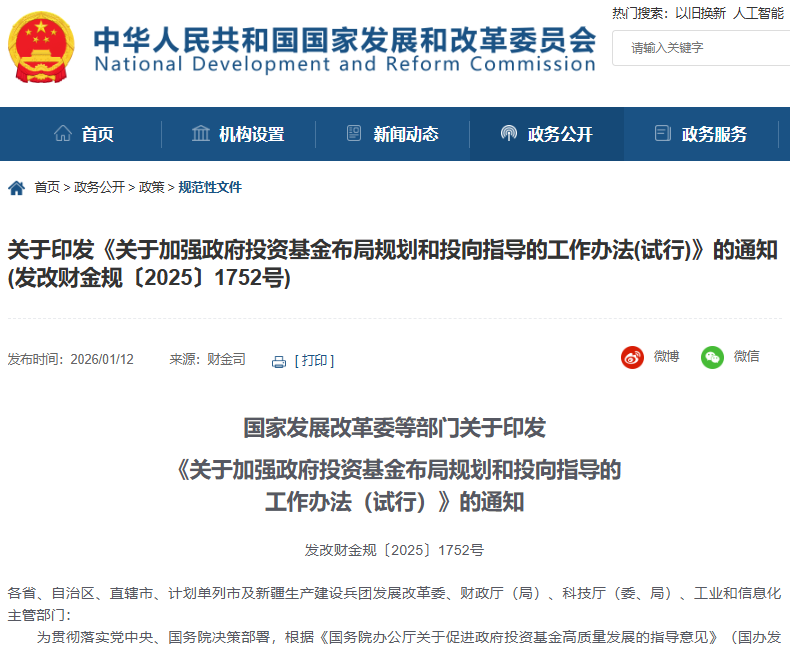 【环球网财经综合报道】2026年1月12日,国家发展改革委、财政部、科技部、工业和信息化部等四部门联合印发《关于加强政府投资基金布局规划和投向指导的工作办法(试行)》,并同步出台《政府投资基金投向评价管理办法(试行)》。作为首次在国家层面对政府投资基金布局和投向作出的系统规范,这两份文件明确了政府投资基金的运作方向,强调要优化基金布局,坚持“投早、投小、投长期、投硬科技”,重点支持新质生产力发展。