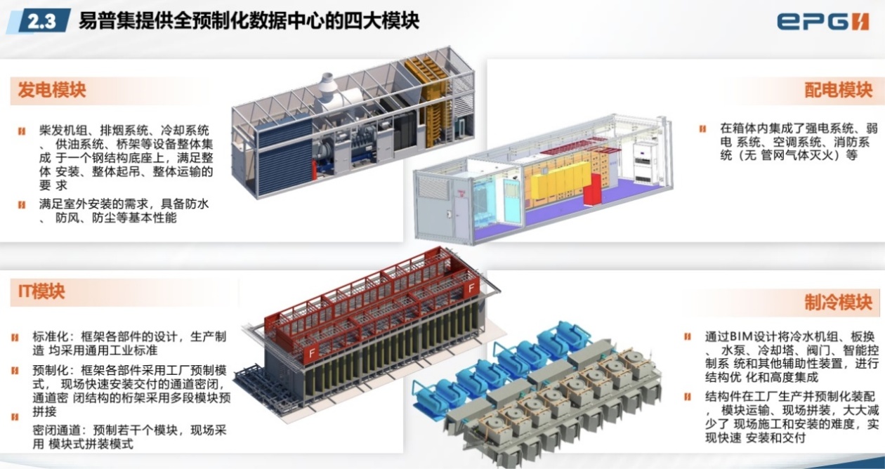 易普集成立于2004年,由数据中心领域行业经验超过二十年的团队创立。公司定位为模块化数据中心(MDC)解决方案提供商,通过将发电、配电、IT、制冷四大核心模块在工厂进行标准化预制与集成,大幅缩短数据中心的建设周期并降低成本。公司在海外已建立超级工厂和整建制交付团队,帮助客户进行全球数据中心交付。