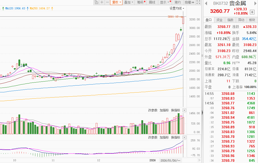 【环球网消费综合报道】1月26日,贵金属市场迎来高光时刻,黄金概念股全线爆发,成为资本市场关注的焦点。受现货黄金价格强势突破5000美元并持续走高的提振,A股黄金板块个股表现抢眼,湖南黄金、盛达资源、福达合金、豫光金铅均以“一字”涨停开盘,中国黄金、恒邦股份、四川黄金、招金黄金等近十只个股亦强势封死涨停板,晓程科技、铜陵有色、西部黄金、曼卡龙等多股强势跟涨。期货市场同步走强,沪金主力合约早盘大涨3.73%,盘中亦刷新历史高点。