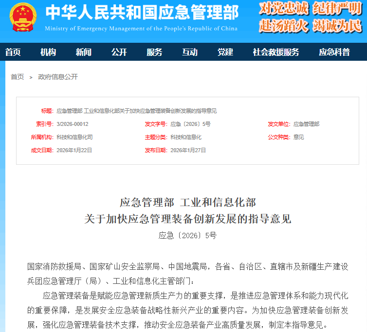 【环球网财经综合报道】资本市场迎来了重磅政策利好。2026年1月27日,应急管理部、工业和信息化部印发《关于加快应急管理装备创新发展的指导意见》,明确提出加强重点装备攻关,推动应急管理装备与人工智能、5G、大数据、物联网等前沿技术深度融合。