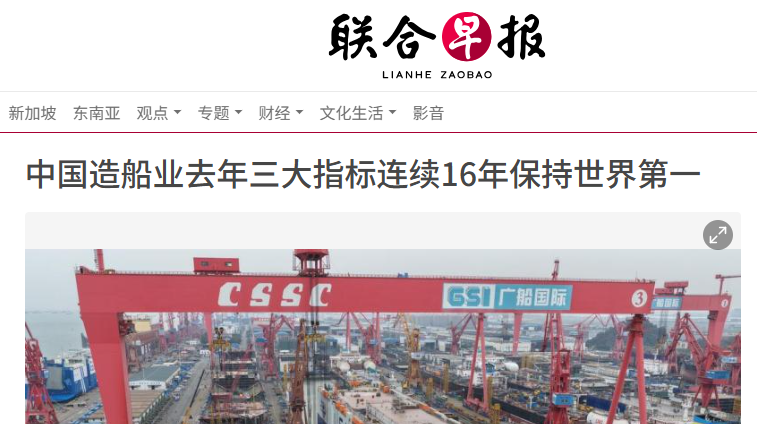 【环球网财经综合报道】据《联合早报》消息,中国造船业在2025年继续保持强劲的发展势头,造船完工量、新接订单量和手持订单量三大核心指标继续领跑全球,连续16年保持世界第一的霸主地位,充分展现了中国作为世界造船大国的雄厚实力与产业韧性。