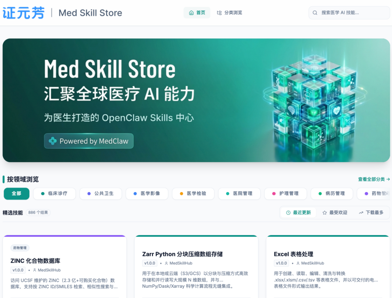【环球网财经综合报道】3月13日,轻松健康集团正式上线证元芳 MedClaw Skills Store,首批上线 886 个标准化 Skill,覆盖临床诊疗、公共卫生、医学影像、医学检验、医院管理、护理管理、病历管理、药物管理八大核心医疗场景。据公开信息,这是医疗行业首个Skill商店 ,也是轻松健康在医疗 AI 领域持续加码布局的又一关键落子。